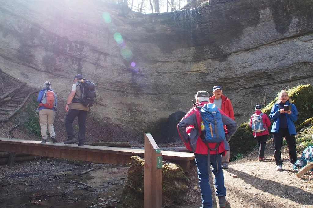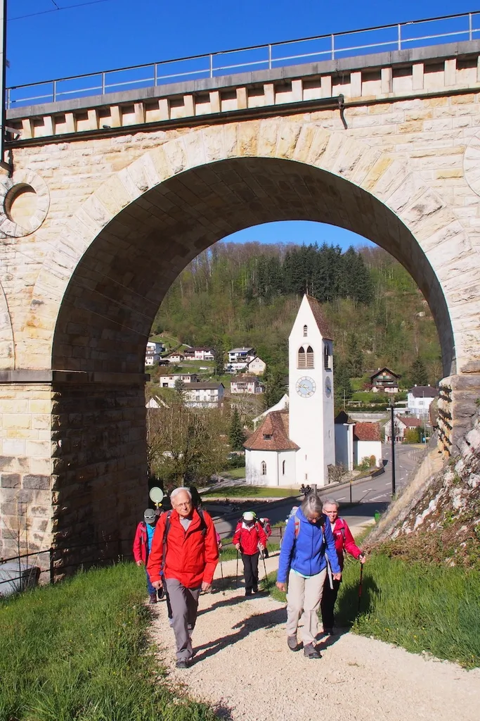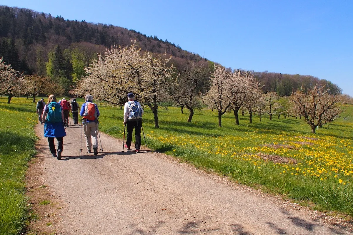 Nach der coronabedingten Pause waren am Dienstag, 27.4.2021, neun Aargauer Naturfreunde aus den Sektionen Oftringen, Neuenhof und Aarau und ein Gast im Oberbaselbiet auf einer Blueschtwanderung wieder gemeinsam unterwegs. Bei wunderbarem Frühlingswetter zogen wir von Rümlingen unter dem berühmten Bahnviadukt durch, um auf dem Bahnerlebnispfad ins idyllische Seitental Chrindel zu gelangen, welches in einem beeindruckenden Talkessel mit Wasserfall in einer vermeintlichen Sackgasse endet. Nach einer Znünipause meisterten wir den Aufstieg ins Reich der Kirschbäume mit Leichtigkeit und verweilten dabei auch noch beim liebevoll eingerichteten Hofladen des Rütihofs. Die Freude war gross, dass entgegen aller Unkenrufe eine Grosszahl der Kirschbäume noch in voller Blüte standen. Auch nach der Passage des schmucken Dorfes Häfelfingen konnten wir im Kirschgarten nochmals ein Meer von weissen Blüten durchwandern, in der Ferne leuchteten auch gelbe Rapsfelder. Nach dem Besuch der vorbildlich restaurierten Ruine Homburg genossen wir bei einem ausgiebigen Brätel-Picknick diesen schönen und warmen Frühlingstag weiter. Auf der Terrasse der Bäckerei in Läufelfingen rundeten wir diese in aller Hinsicht gelungene Wanderung vor der Rückreise mit Kaffee und Dessert bzw. einem kühlen Glas Bier ab.